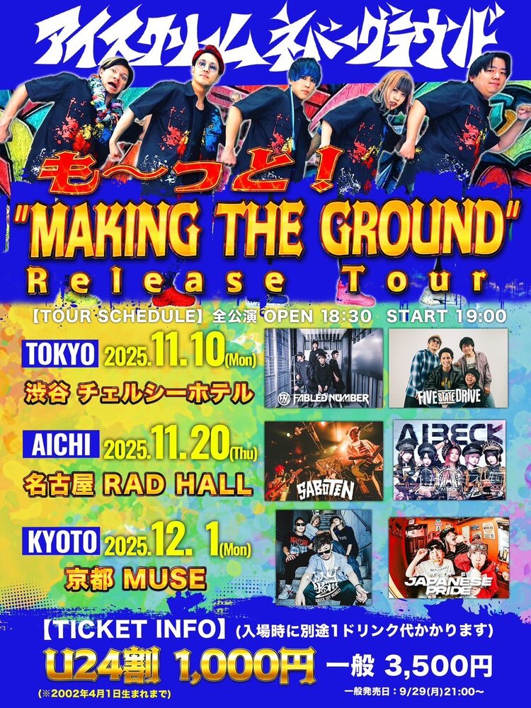 アイスクリームネバーグラウンドpre. "も~っと!MAKING THE GROUNDリリースツアー" SCHEDULE 2025/12/01(月) 京都MUSE 京都 OPEN/START 18:30/19:00 -act- ・アイスクリームネバーグラウンド ・KNOCK OUT MONKEY ・THE JAPANESE PRIDE 🎫TICKET 一般発売9/29(月)21:00~ 🎟チケット予約はコチラから URLをコピーする 報告する