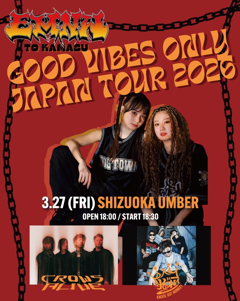 EMNW To KAMASU – GOOD VIBES ONLY JAPAN TOUR 2026 SCHEDULE 2026/03/27(金) 静岡UMBER 静岡 OPEN/START 18:00/18:30 -act- EMNW CROWS ALIVE KNOCK OUT MONKEY 🎫 ¥3,500(+1drink) 1/27(火)10:00〜 https://eplus.jp/emnw/ URLをコピーする 報告する